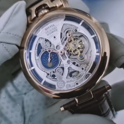 - Intricate Craftsmanship: A complex skeleton dial reveals the intricate Automatic Self-Wind movement beating within.